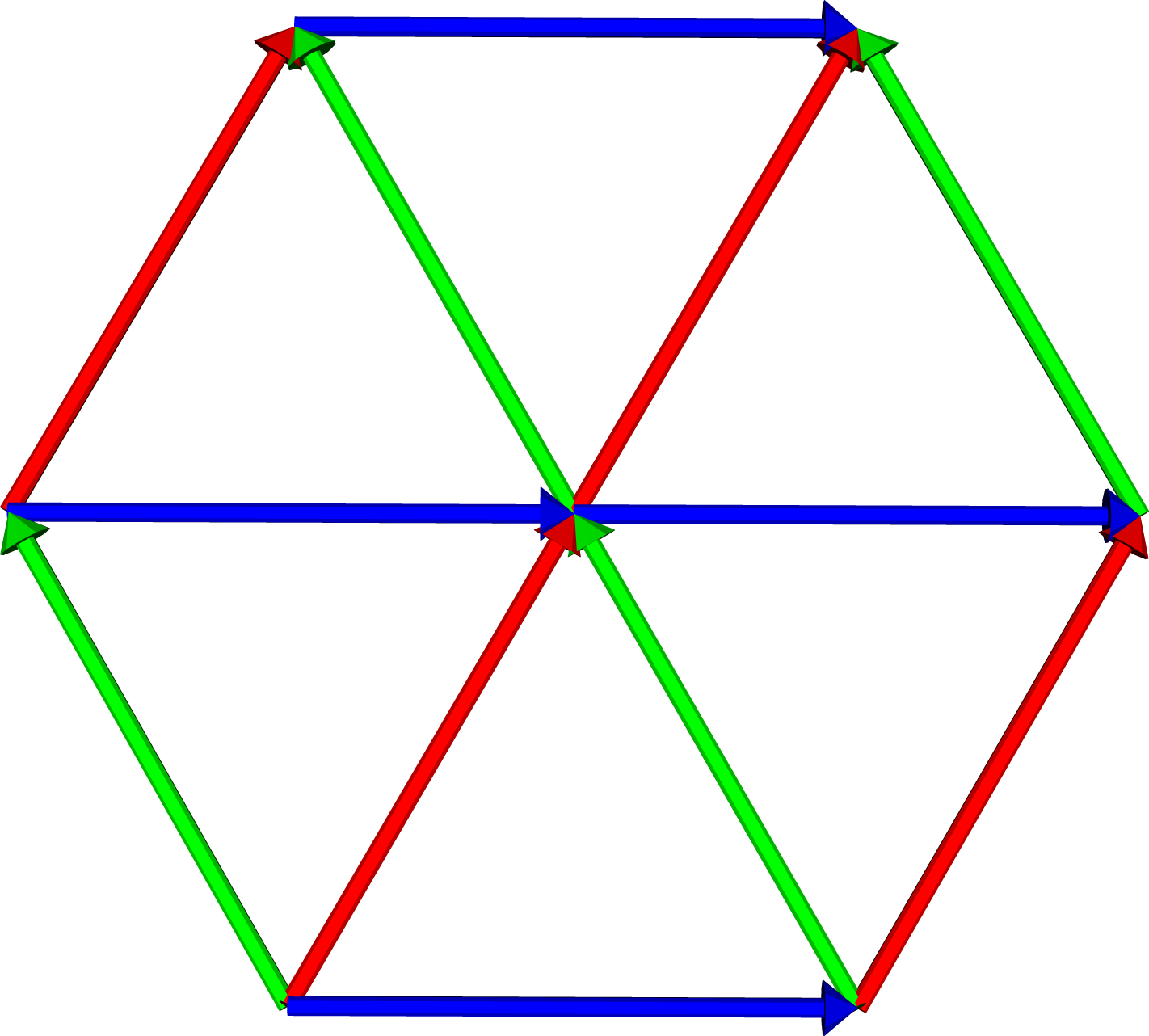 and both \(\lambda_3\) and \(\lambda_8\) correspond to \((0,0)\text{.}\) As with \(\su(2)\text{,}\) we recover almost all of the structure of the Lie algebra by plotting these points. The result is shown in Figure 1.10.1, and is called the root diagram of \(\su(3)\). Each family of parallel lines represents the action of one of the three pairs of eigenvectors on the other eigenvectors; again, the eigenvectors can be thought of as raising and lowering operators. It is a useful exercise to work out all the commutators, and to compare the result with the root diagram.