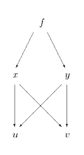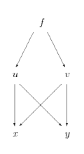 An easy way to remember such formulas is to use a tree diagram, as shown in the first diagram in Figure 4.10.1. To use a tree diagram, determine which derivative you want to take, in this case the derivative of \(f\) with respect to \(u\text{.}\) Now follow all possible paths from \(f\) to \(u\text{,}\) with each arrow corresponding to a derivative of the “top” quantity with respect to the “bottom” quantity, and where in each case the variable(s) not pointed to by the arrow are to be held constant.