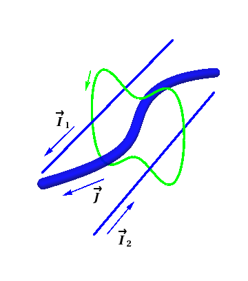 This situation is illustrated in Figure 13.2.1, which shows an arbitrary oriented loop, through which two thin wires carry currents \(\II_1\) and \(\II_2\text{,}\) and a third wire with larger cross-section having volume current density \(\JJ\text{.}\) In this case, \(I_{\textrm{enclosed}}\) would be the total current flowing through any surface bounded by the given loop, and would therefore be the result of adding the sum of the components of the currents in the two thin wires perpendicular to the surface to the flux of \(\JJ\) across the surface.