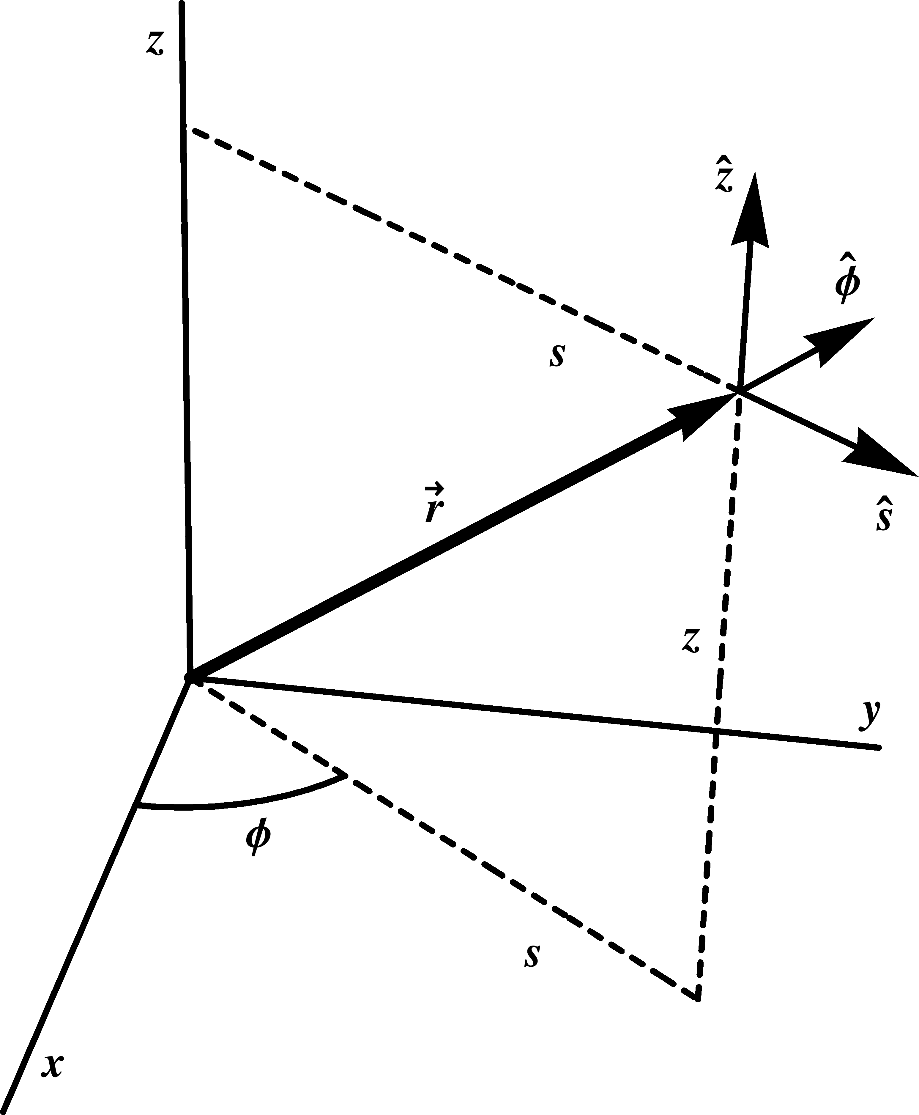 Imagine that the origin of coordinates is behind you in the corner of the room you are sitting in, on the floor, on the left-hand side. Think of your right shoulder as a point in space. You should use your right arm to represent, successively, each of the basis vectors \(\xhat\text{,}\) \(\yhat\text{,}\) and \(\zhat\) in rectangular coordinates, \(\shat\text{,}\) \(\phat\text{,}\) and \(\zhat\) in cylindrical coordinates and \(\rhat\text{,}\) \(\that\text{,}\) and \(\phat\) in spherical coordinates.