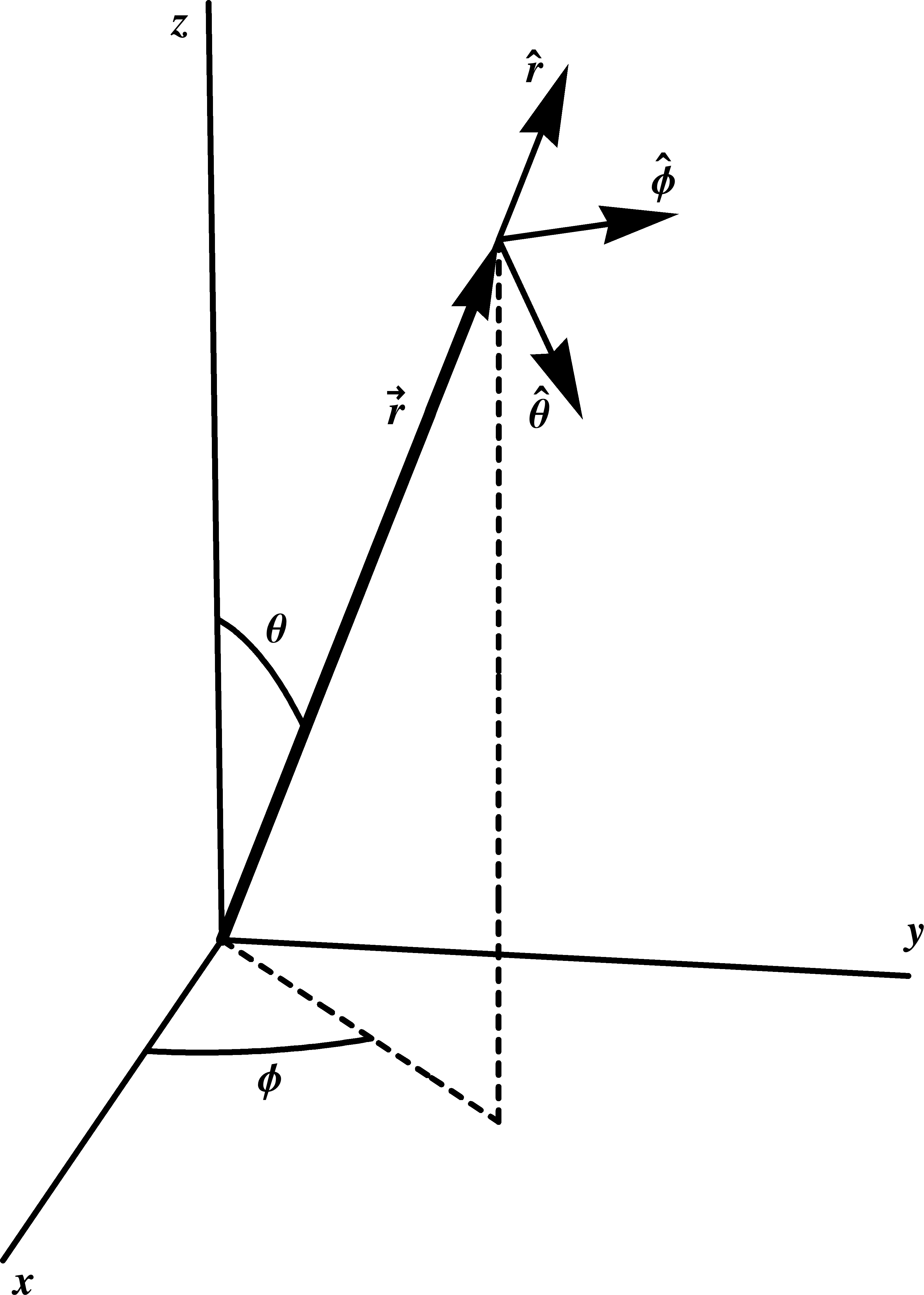 When using curvilinear coordinates (see Section 3.2) it is often useful to expand the vector in terms of unit vectors associated with the curvilinear coordinates instead of the rectangular basis vectors above. For example, just as \(\xhat\) points in the direction in which \(x\) increases, \(\rhat\) is defined to be the unit vector pointing in the direction of increasing \(r\) (with the other coordinates held fixed). 1