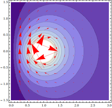 Figure17.5.1.The magnetic field \(\BB\text{,}\) shown in a vertical plane with the \(z\)-axis at the left, superimposed on top of the level curves of \(A_\phi\text{.}\)