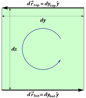 Consider first the horizontal edges, on each of which \(d\rr=dy\,\yhat\text{.}\) However, when computing the circulation of \(\AA\) around this loop, we traverse these two edges in opposite directions. In particular, when traversing the loop in the counterclockwise direction, \(dy\lt 0\) on top and \(dy>0\) on the bottom. We would like to compare these two edges, but we have