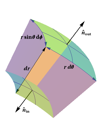 where \(\rhat\) is the unit vector in the radial direction. The electric field of a point charge would have this form. What is the flux of \(\EE\) through a small box around an arbitrary point \(P\text{,}\) whose sides are surfaces with one of the spherical coordinates held constant, as shown in Figure 14.4.1? Only the two sides which are parts of spheres contribute, and each such contribution takes the form