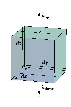 Consider first the vertical contribution, namely the flux up through the top plus the flux down through the bottom. These two sides each have area element \(dA=dx\,dy\text{,}\) but the outward normal vectors point in opposite directions, that is