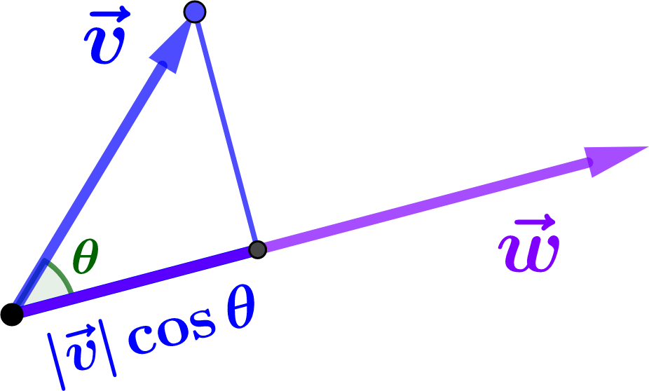 where \(\theta\) is the angle between \(\vv\) and \(\ww\text{.}\) Now we notice something interesting: If \(\vv\) is the vector along the hypotenuse of the triangle in Figure 3.7.1, then \(|\vv|\cos\theta\) is the projection of \(\vv\) onto the direction of \(\ww\text{,}\) the other vector. Similarly, \(|\ww| \cos\theta\) is the projection of \(\ww\) onto the direction \(\vv\text{,}\) so the dot product is a symmetrized version of projection.