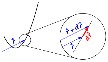describes the location of the point \((x,y,z)\) in rectangular coordinates, and is usually thought of as pointing from the origin to that point. It is instructive to draw a picture of the small change \(\Delta\rr=\Delta x\,\xhat + \Delta y\,\yhat + \Delta z\,\zhat\) in the position vector between nearby points. Try it! This picture is so useful that we will go one step further, and consider an infinitesimal change in position. Instead of \(\Delta\rr\text{,}\) we will write \(d\rr\) for the vector between two points which are infinitesimally close together. This is illustrated in Figure 6.1.1, which shows a view of the curve through an “infinite magnifying glass”.
