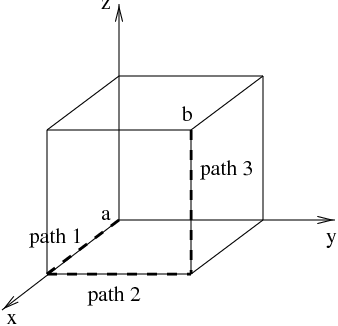 Geometrically determine the length of the three paths leading from \(a\) to \(b\text{.}\) Notice that, along any of these three paths, only one coordinate \(s\text{,}\) \(\phi\text{,}\) or \(z\) is changing at a time (i.e. along path 1, \(dz\ne0\text{,}\) but \(d\phi=0\) and \(dr=0\)).