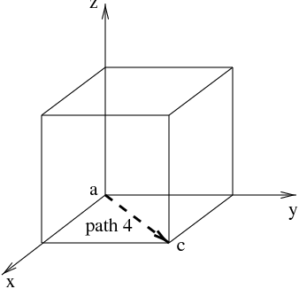 Given the cube shown below, find \(ds\) on each of the three paths, leading from \(a\) to \(b\text{.}\)