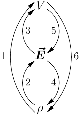 It remains to show how to recover the charge density from the potential (arrow number 6), at which point we are able to compute any one of the quantities \(\EE\text{,}\) \(V\text{,}\) and \(\rho\) from any of the others.