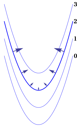 You can also visualize the gradient using the level surfaces on which \(f(x,y,z)=\hbox{ const}\text{.}\) (In two dimensions there is the analogous concept of level curves, on which \(f(x,y)=\hbox{ const}\text{.}\)) Consider a small displacement \(d\rr\) that lies on the level surface, that is, start at a point on the level surface, and move along the surface. Then \(f\) doesn't change in that direction, so \(df=0\text{.}\) But then