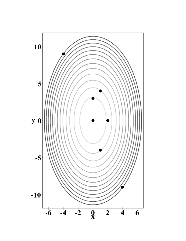 Figuring out the location of the top of the hill, and its height, should have been straightforward. But drawing level curves — the topo map for the hill, shown in Figure 10.4.1 — is not so easy. Don't skip this step! Feel free to use a graphics program to generate these drawings, but it is important to develop the ability to translate between equations and topo maps.