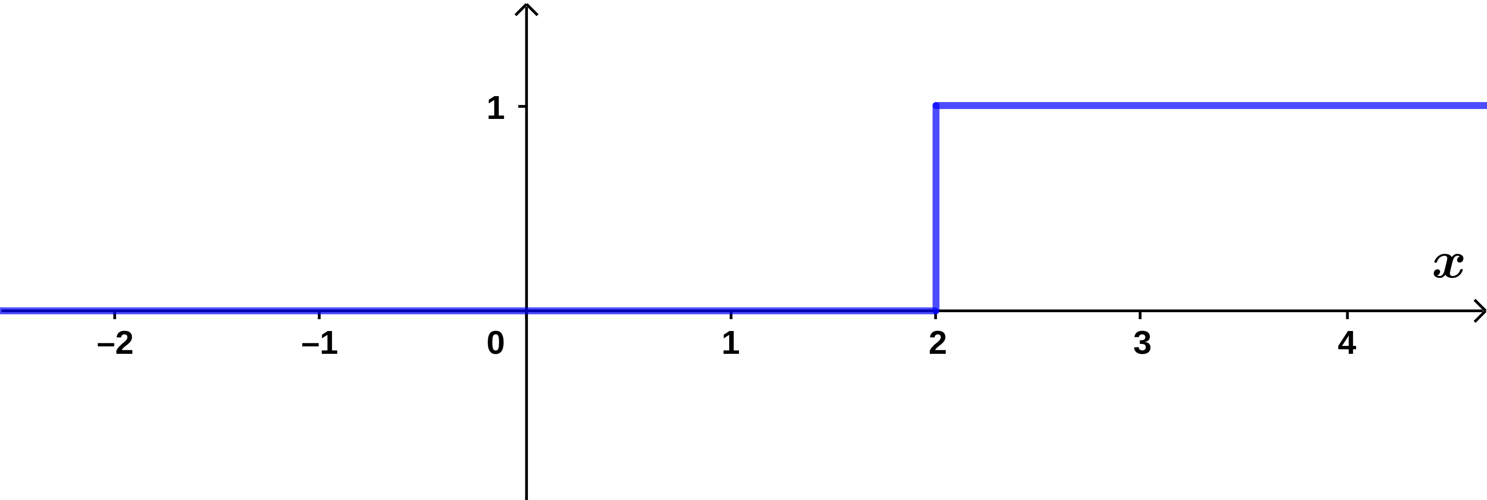 By shifting the argument of the function, it is possible to put the discontinuity of the theta function wherever we need it. In Figure 8.1.2 you can see that the graph of \(\Theta(x-2)\) has discontinuity at \(x=2\text{,}\) instead of at \(x=0\text{.}\)