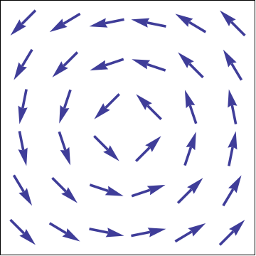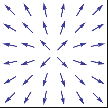 A vector field, \(\FF\text{,}\) is a function whose output is a vector at each point in the domain of the function. Each such vector should be thought of as "living" (having its tail at) the point at which it is defined, rather than at the origin. A vector field is often written as any of \(\FF(P)\text{,}\) \(\FF(\rr)\text{,}\) \(\FF(x,y,z)\text{,}\) etc., that assigns a vector to each point in the domain, designated by \(P\text{,}\) \(\rr\text{,}\) or \((x,y,z)\text{,}\) respectively.