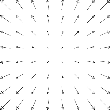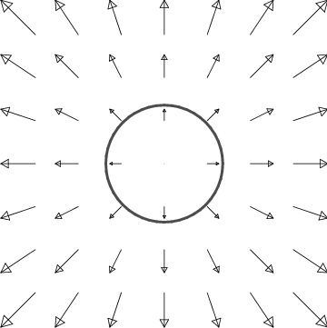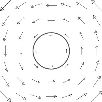 Finally, it is important to realize that not all vector fields which point away from the origin have divergence. The example in Figure 14.6.4 demonstrates this important principle; it has no divergence away from the origin. This figure represents a solution of Maxwell's equations for electromagnetism, and describes the electric field of an infinite charged wire