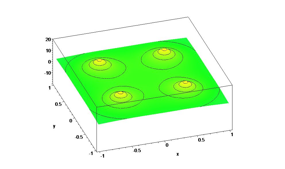 Because our perception of color is not very fine grained, it is difficult to read an accurate numerical value for the electrostatic potential from a colored graph. We would really like to use the vertical direction on the graph to represent the value of the scalar field, just as we would for functions of one or two variables. But then we cannot show all three spatial directions of the scalar field at once. Figure 4.4.4 shows yet another representation of the electrostatic potential due to four point charges.