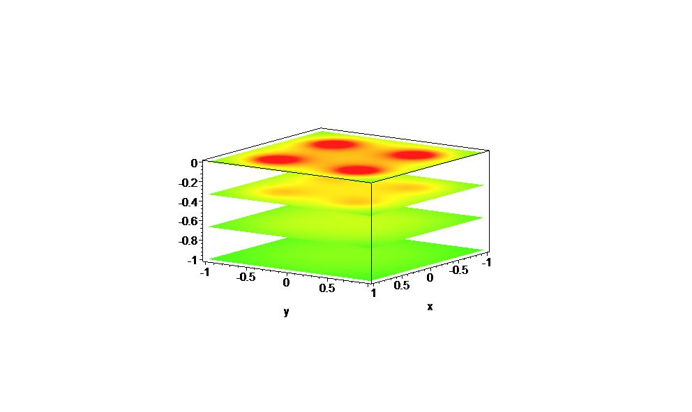 Another possibility is to use color to represent the value of the electrostatic potential. Then the scalar field is represented by a color at each point in space. If we had a great virtual reality program, we could imagine moving through space, examining the colors as we moved around. While we are waiting for that technology to arrive in our classroom, we'll show a picture of some cross sections through space with colors on them. See Figure 4.4.3, for the same example of the electrostatic potential due to four point charges in this new graphical representation.