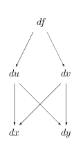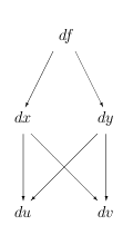 An easy way to remember such formulas is to use a tree diagram, as shown in the first diagram in Figure 9.10.1. To use a tree diagram, determine which derivative you want to take, in this case the derivative of \(f\) with respect to \(u\text{.}\) Thus, you need to express \(df\) in terms of \(du\text{.}\) Now follow all possible paths from \(df\) to \(du\text{,}\) with each arrow corresponding to an expansion of the “top” quantity in terms of the “bottom” quantity, that is, to a partial derivative, where the variable(s) not pointed to by the arrow are to be held constant.