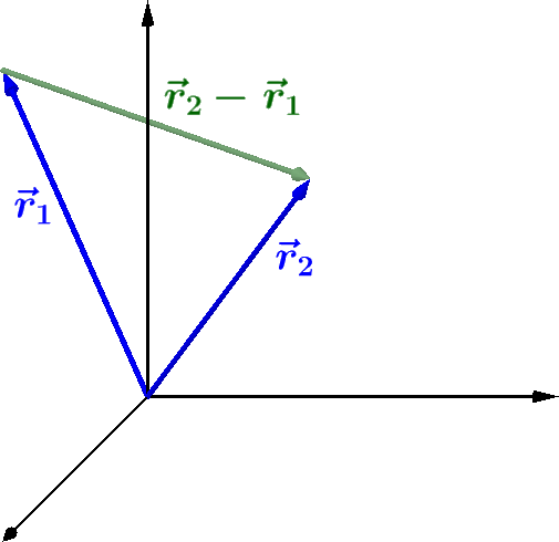 But what if the theoretician wants to use a coordinate independent expression in her formulas. How does she say where the objects are? By using the position vectors \(\vec{r}_1\) and \(\vec{r}_2\text{.}\) Figure 1.14.2 shows the position vectors \(\vec{r}_1\) and \(\vec{r}_2\) for two objects, as well as their difference, \(\vec{r}_2-\vec{r}_1\text{.}\) The magnitude of this latter vector is the distance between the two objects. The magnitude property of the dot product says that the magnitude of any vector is the square root of the dot product of the vector with itself. Therefore, the distance between the two objects, in coordinate independent form is: