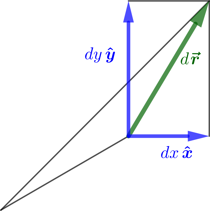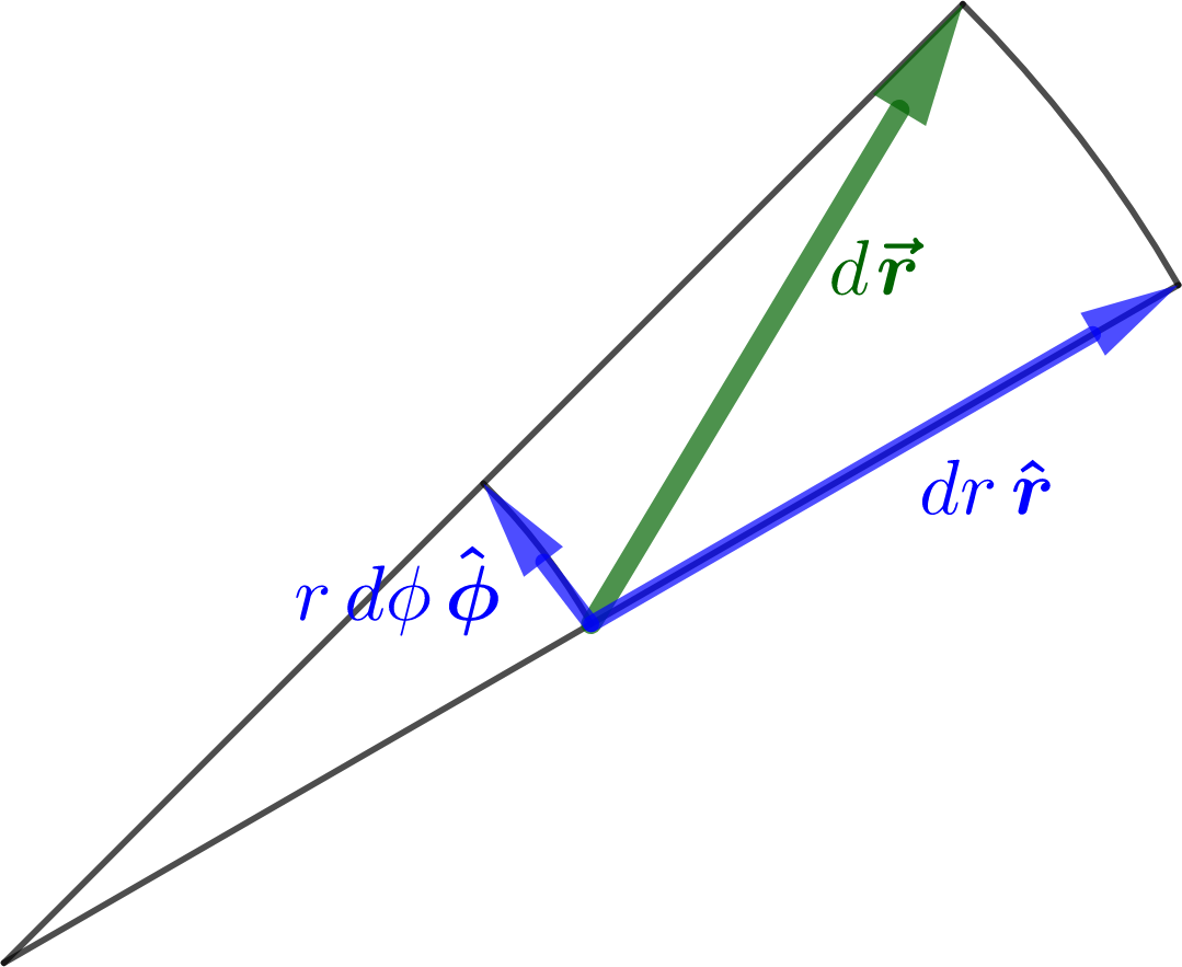 It is important to realize that \(d\rr\) and \(ds\) are defined geometrically, not by the component expressions in (2.2.2) and (2.2.4). Because of this coordinate-independent nature of \(d\rr\text{,}\) it is possible and useful to study \(d\rr\) in another coordinate system, such as polar coordinates (\(r\text{,}\)\(\phi\)) in the plane. 1 It is then natural to use basis vectors \(\{\rhat,\phat\}\) adapted to these coordinates, with \(\rhat\) being the unit vector in the radial direction, and \(\phat\) being the unit vector in the direction of increasing \(\phi\text{;}\) see Section 1.10. 2