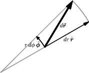 ¶It is important to realize that \(d\rr\) and \(ds\) are defined geometrically, not by the component expressions in (4.2.2) and (4.2.4). Because of this coordinate-independent nature of \(d\rr\text{,}\) it is possible and useful to study \(d\rr\) in another coordinate system, such as polar coordinates (\(r\text{,}\)\(\phi\)) in the plane. 1 It is then natural to use basis vectors \(\{\rhat,\phat\}\) adapted to these coordinates, with \(\rhat\) being the unit vector in the radial direction, and \(\phat\) being the unit vector in the direction of increasing \(\phi\text{;}\) see Section 3.8. 2