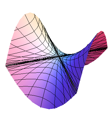 and set \(D=AC-B^2\text{.}\) Then if \(D>0\text{,}\) the term in square brackets is positive, and the graph of h is a paraboloid, which opens up if \(C>0\) (a min), and down if \(C\lt 0\) (a max), as shown in Figures 11.2.2 and Figure 11.2.1, respectively. If \(D\lt 0\text{,}\) then the term in square brackets is positive when \(x=0\text{,}\) but negative when \(y=-\frac{B}{C}x\text{;}\) this is a saddle, as shown in Figure 11.2.3. If \(C=0\) but \(A\ne0\text{,}\) a similar argument can be made replacing \(C\) by \(A\text{.}\) If \(A=0=C\) but \(B\ne0\text{,}\) then \(h=xy\text{,}\) which is easily seen to be a saddle. But if all of \(A\text{,}\) \(B\text{,}\) and \(C\) vanish, anything can happen; we need more information. Since \(D=0\) in this latter case, anything can happen if \(D=0\text{.}\)